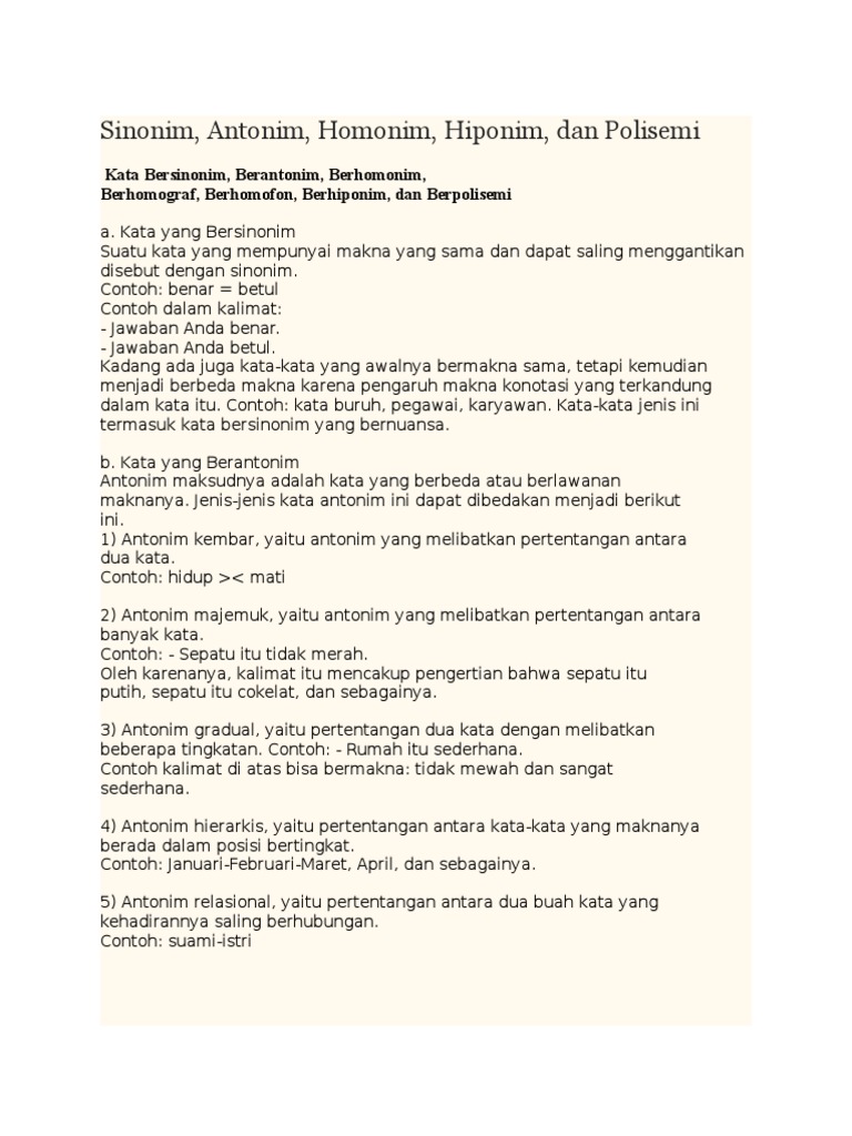 Sinonim Antonim Homonim Hiponim Dan Polisemi 2nv8v821xrlk from idoc.pub Kalimat penjelas adalah kalimat yang berfungsi sebagai pendukung atau penguat gagasan pokok yang ada pada kalimat utama. Hiponim merupakan hubungan makna yang memiliki artian hirarki. Sinonim bisa disebut juga dengan persamaan kata atau padanan kata. Sinomin bisa disebut juga dengan persamaan kata atau padanan kata. Secara harfiah berarti nama yang. Pernah mendengar kalimat wajahnya seputih kertas? Kata hiponim berasal dari bahasa yunani kuno, yaitu hypo yang berarti bawah dan onoma yang berarti nama. Contoh kata hipernim dalam kalimat bahasa indonesia.